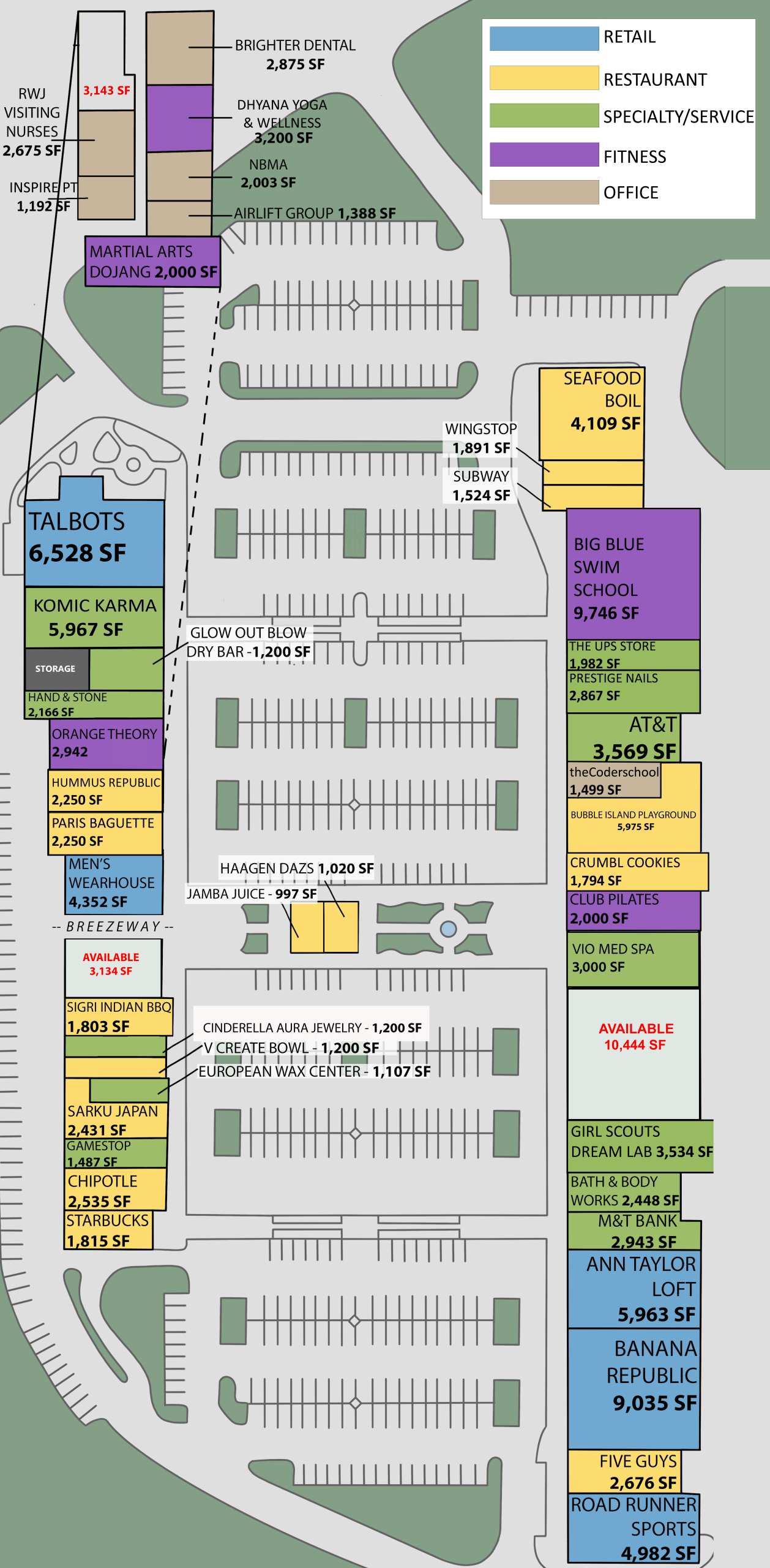 LAYOUT: | One story Premium Lifestyle shopping center (partial two story) consisting of 47 tenant spaces ranging in size up to 10,000 SF with expansive, parking lot and pad site building. | |